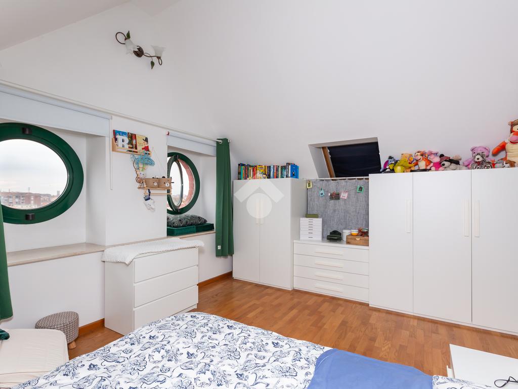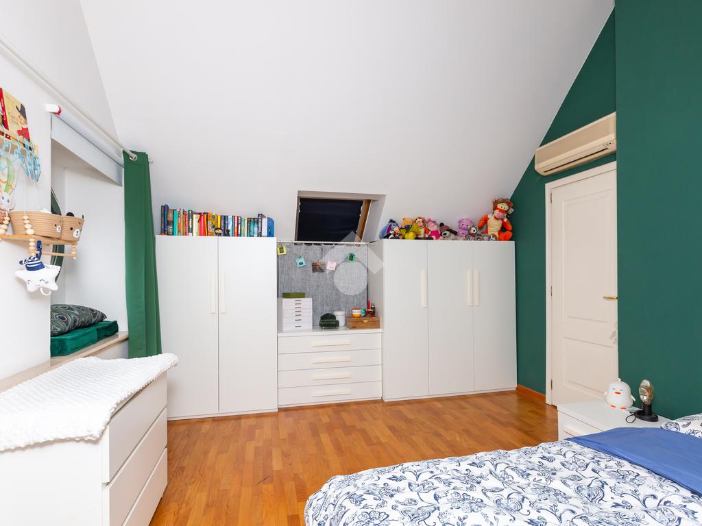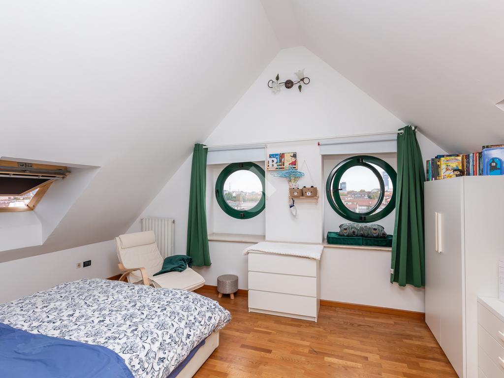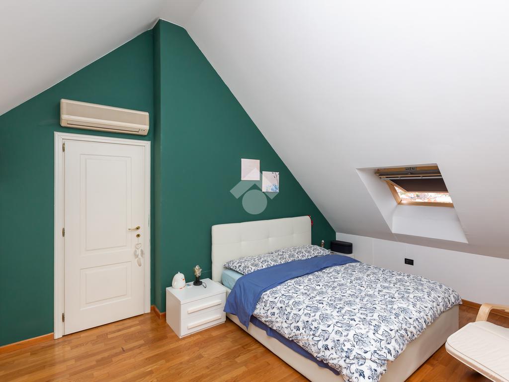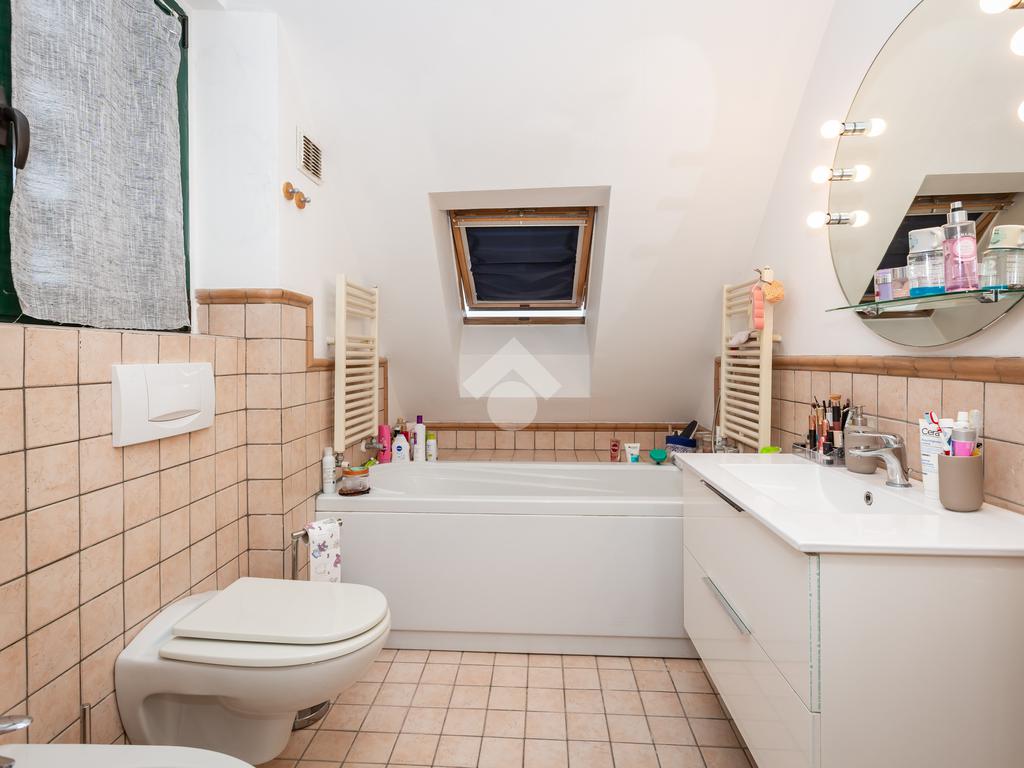 Al terzo livello si trova la camera da letto mansardata con mobili su misura e un servizio finestrato dotato di vasca da bagno.