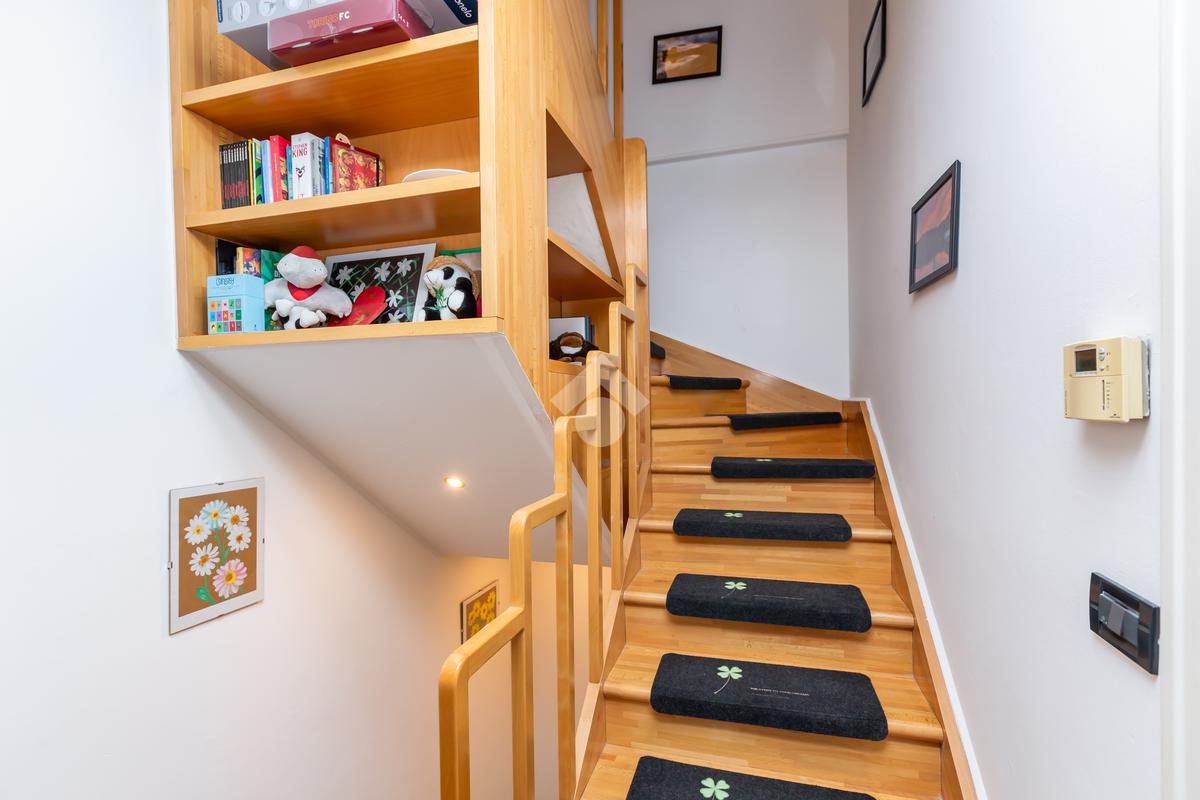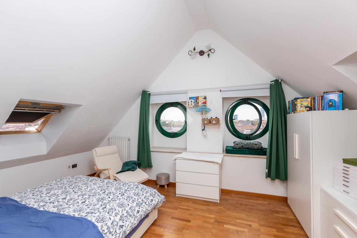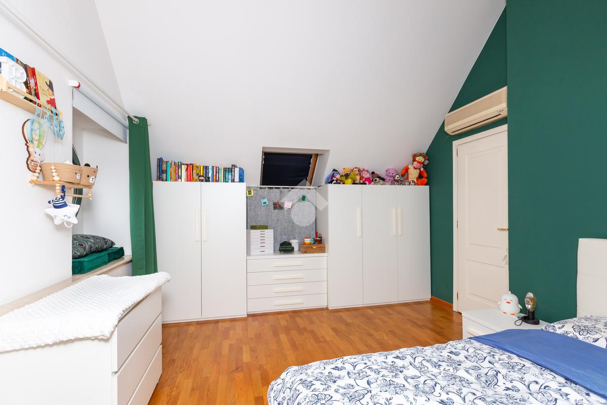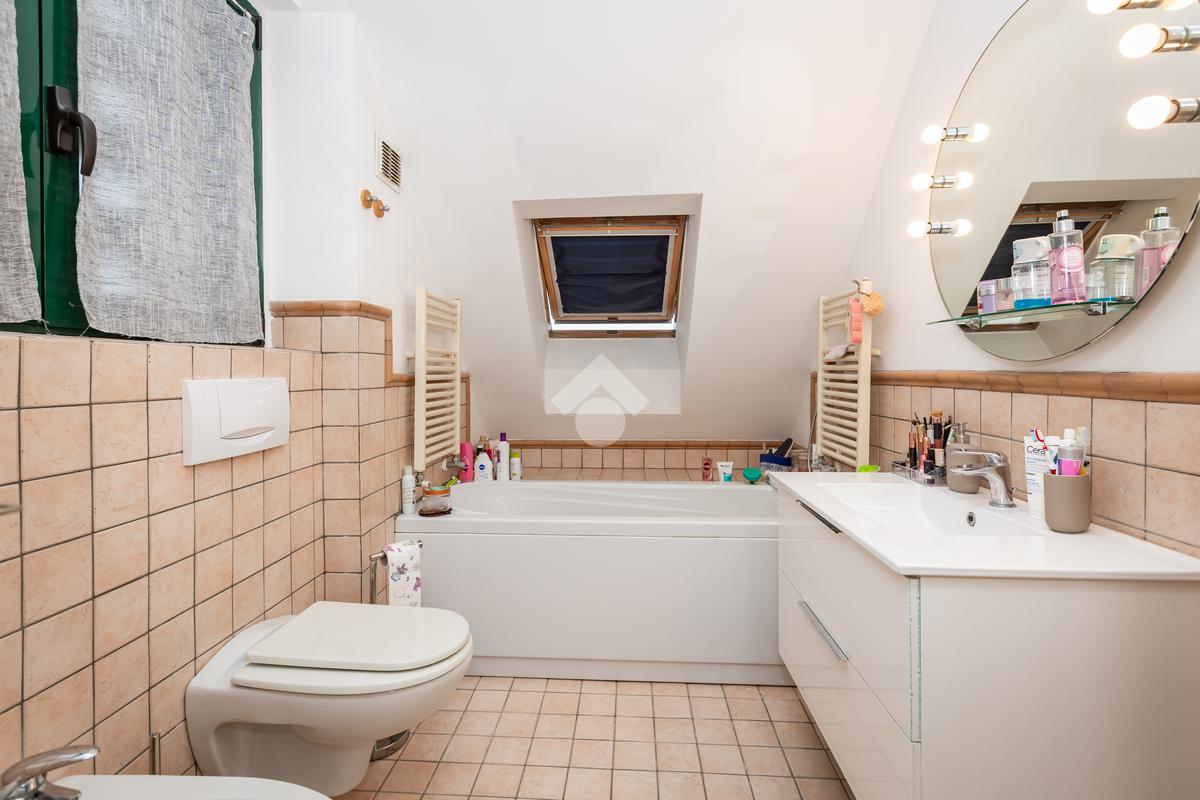 Al terzo livello si trova la camera da letto mansardata con mobili su misura e un servizio finestrato dotato di vasca da bagno.